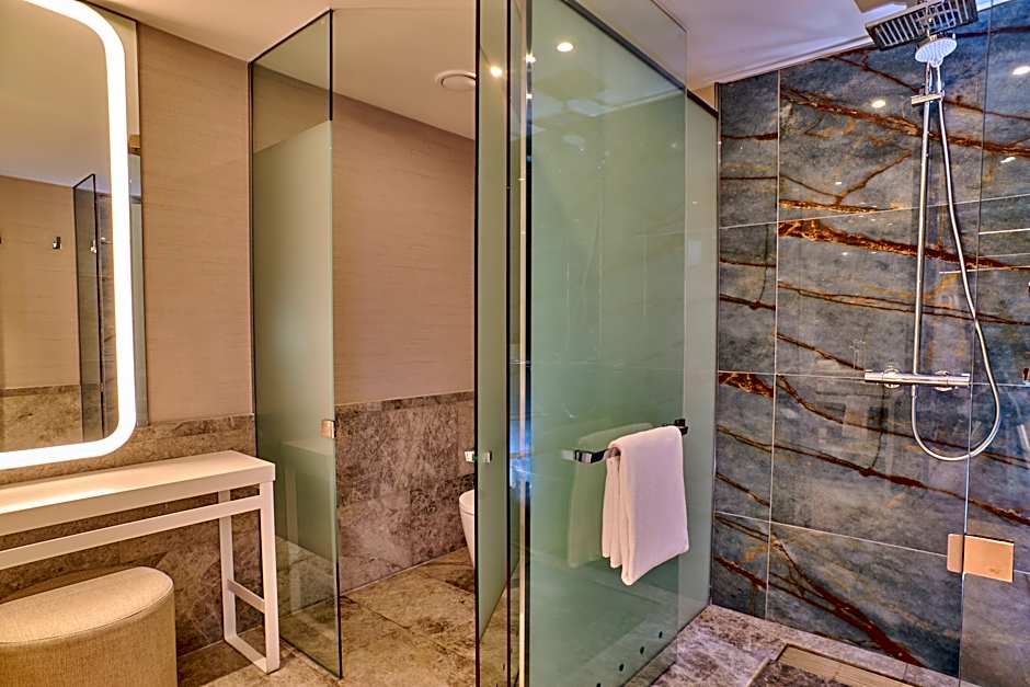 This deluxe room features a queen-size bed, a private bathroom with shower, LCD TV, an electric kettle, electronic safety deposit box, a spacious walk-in closet and a work area. The use of the gym, swimming-pool and spa at Hilton Fitness is also included.